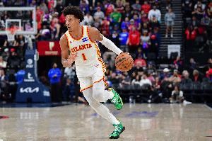 上半场,老鹰球员杰伦·约翰逊表现出色,不但拿到全队最高分同时也很全能,防守端更是死亡缠绕,在18分半的时间里,投篮12中7,三分球3中3,罚球4中3,轰下20分5篮板8助攻5抢断的数据,正负值+18。